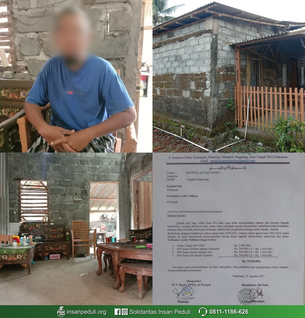 🔹Qodarullah beliau saat ini menunggak biaya pendidikan putrinya, Farhania yang saat ini belajar di Pondok Pesantren Tahfidzul Quran Al Furqon Magelang. Total tunggakan yang harus beliau bayar sebesar Rp10.920.000. Alhamdulillah putri beliau telah memiliki hafalan Al-Quran 3 Juz.
